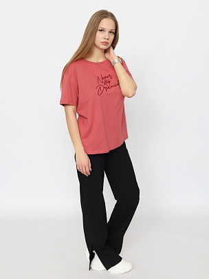 Футболка прямого силуэта длиной по линию бедер. Короткий рукав. Круглая горловина обработана узкой притачной обтачкой из рибаны с эластаном. Полочка декорирована вышивкой "никогда не переставай мечтать".