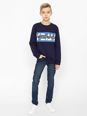 Джемпер для мальчика свободного силуэта с карманом спереди и притачным эластичным поясом по низу. Горловина круглая, обработана притачным воротником из полотна с эластаном. Рукава длинные с эластичными манжетами по низу. Перед джемпера декорирован принтом "Маленькие шаги приводят к большим переменам".